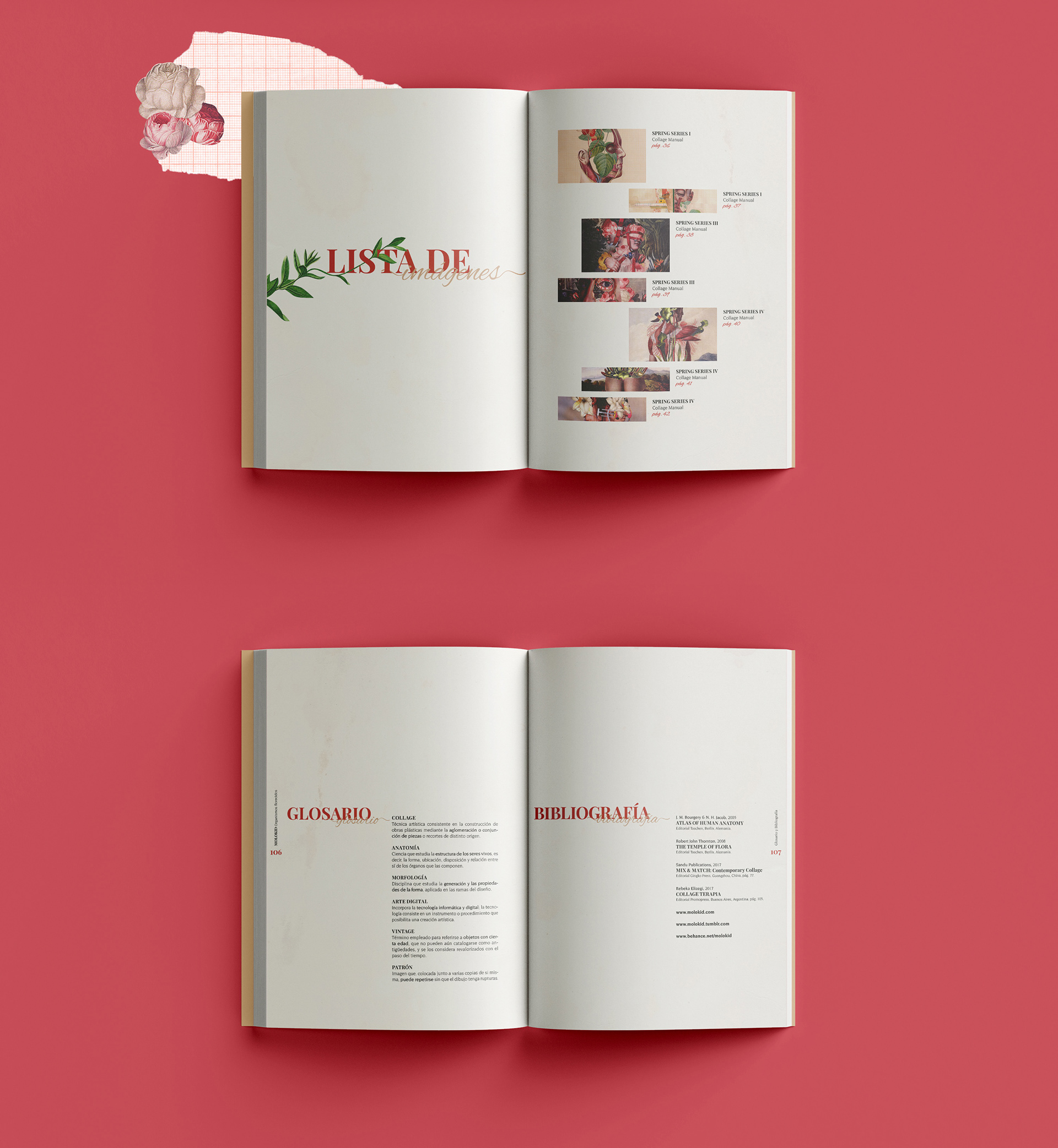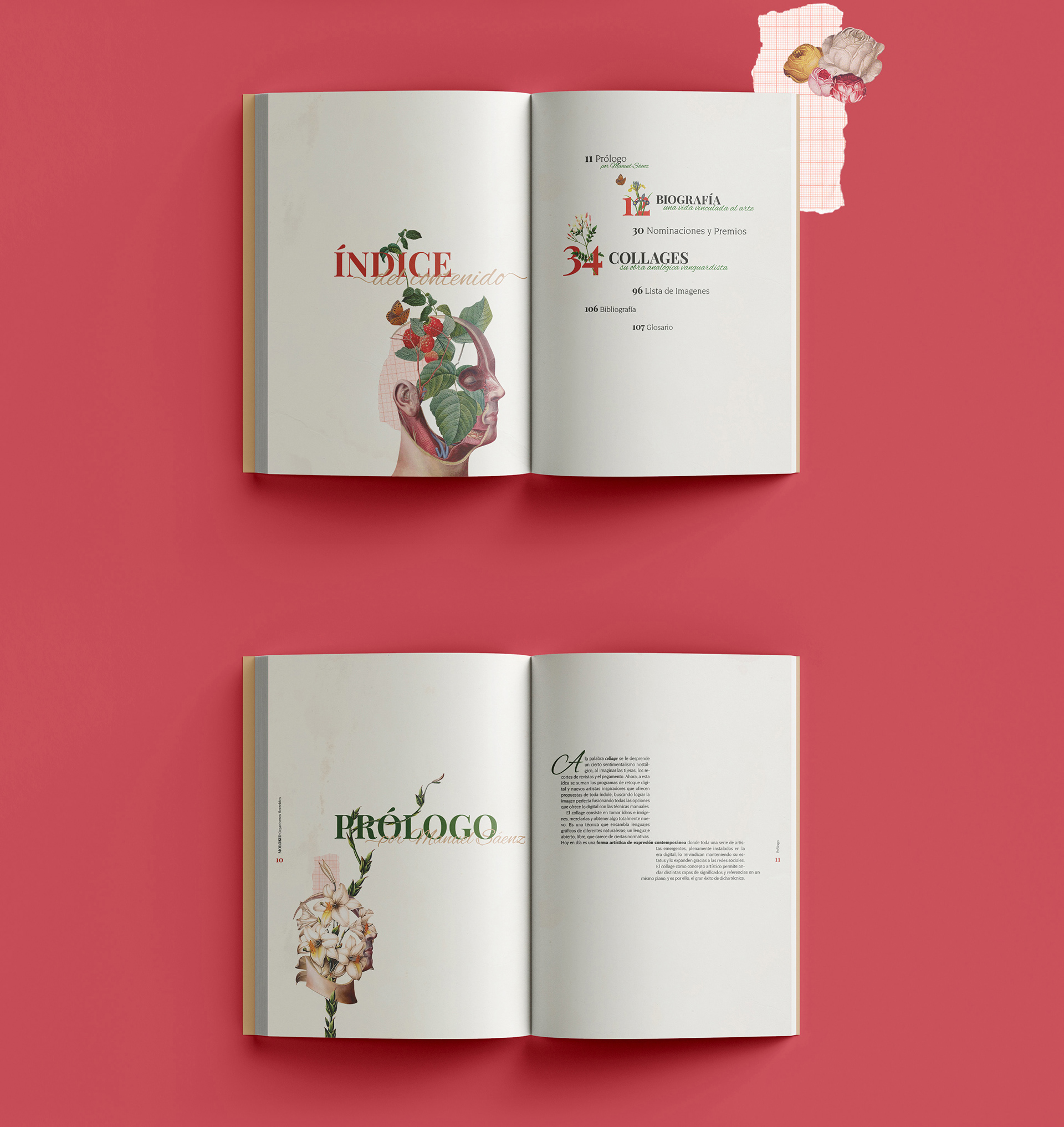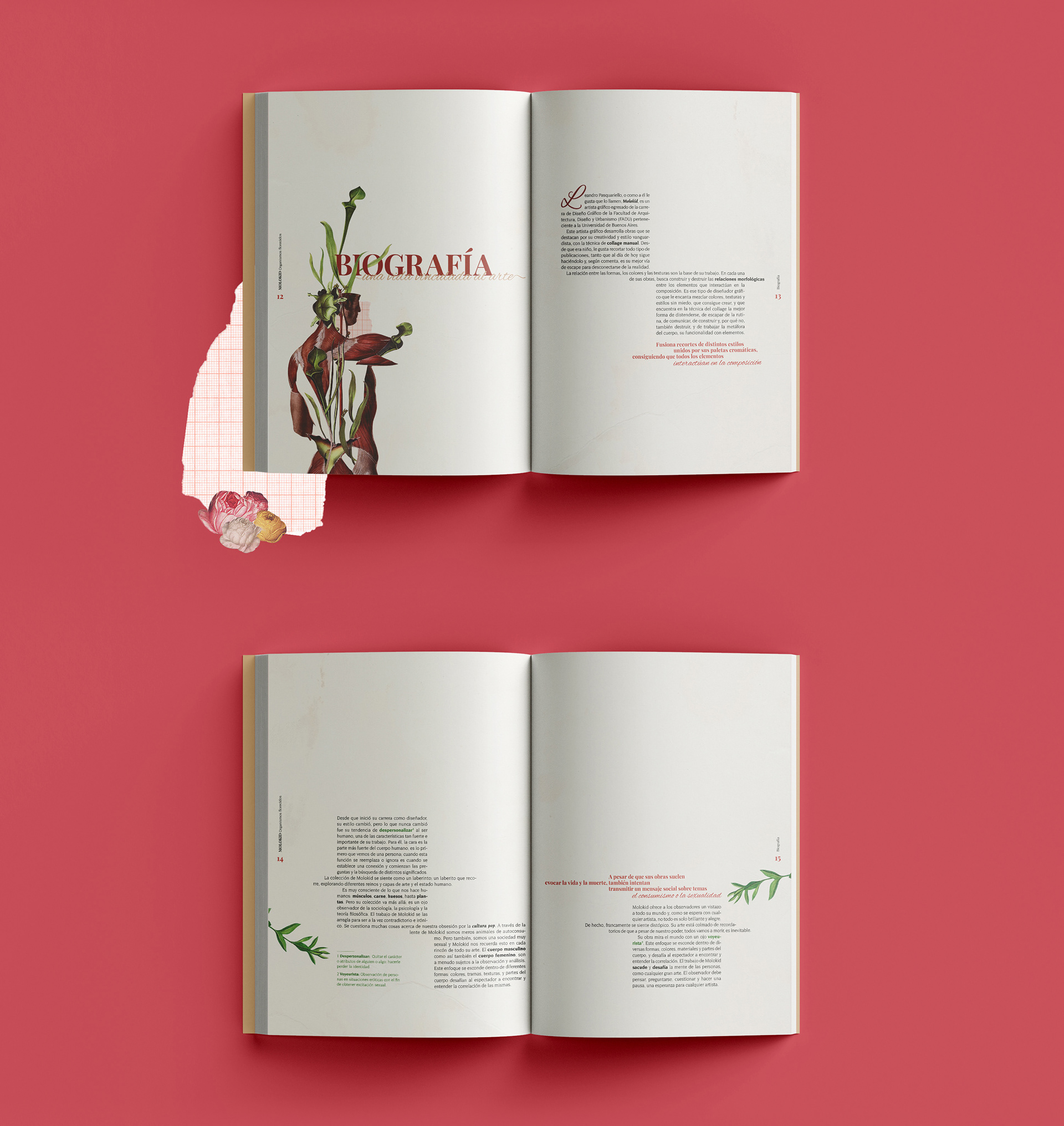 Molokid: Flowered organisms is an academic editorial design project where the main concept is the work of Molokid, a graphic artist graduated from the Universidad de Buenos Aires (UBA) in Graphic Design. Molokid develops works that stand out for their creativity and avant-garde style with the manual or digital collage technique. To find out more about him click here.